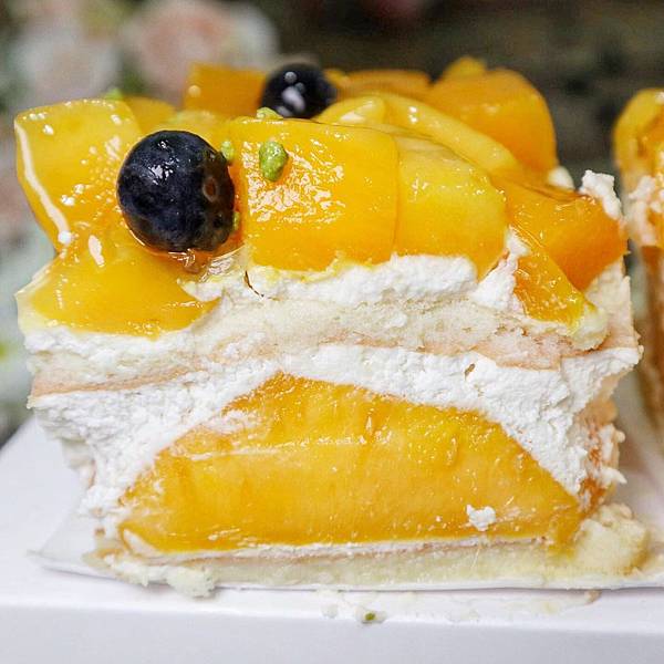 不只上面鋪滿了芒果,從剖面也看到裡面厚厚的奶油層夾著整片大塊的芒果果肉。